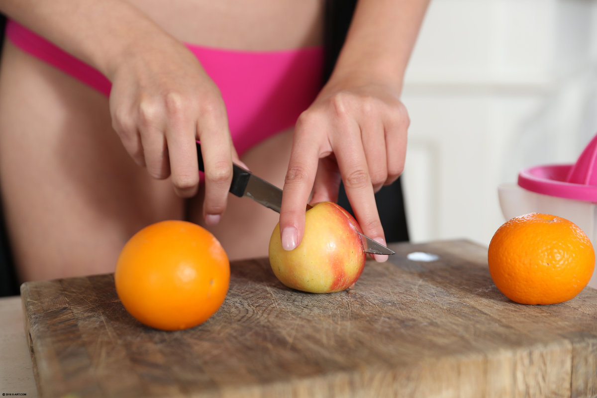 Белая девушка с красивыми сиськами ест разнообразные фрукты перед жестким трахом