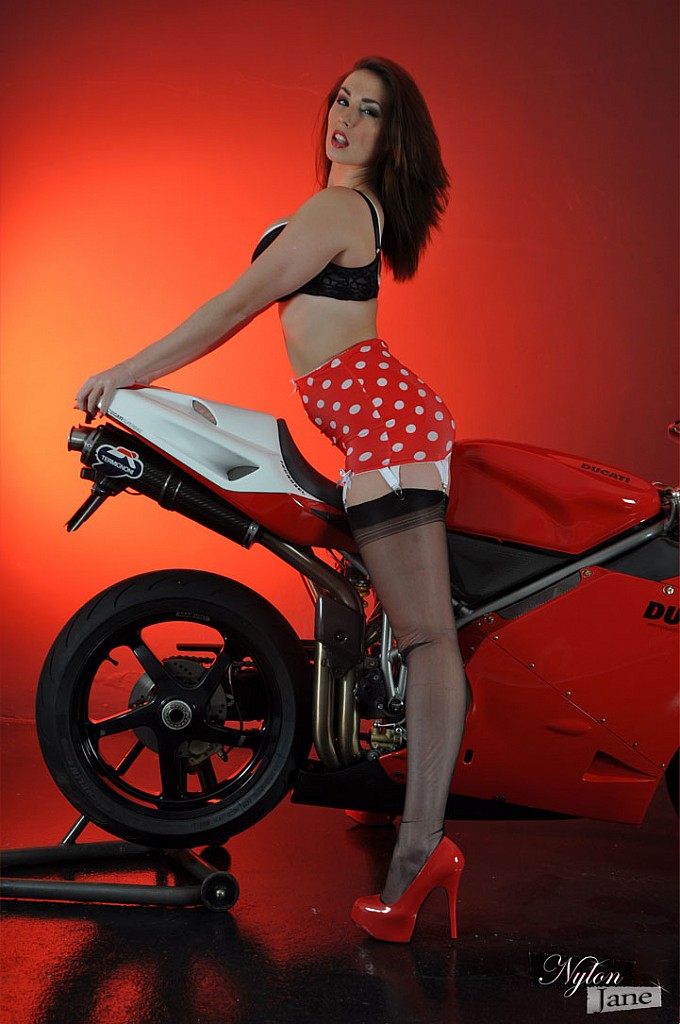 Британская модель Пейдж Турнах дразнится в поясе в горошек на мотоцикле