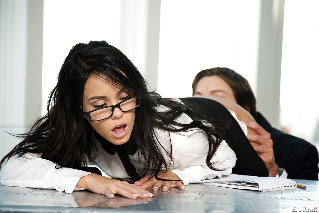 Брюнетка-порнозвезда Меган Рейн, украшенная очками, занимается жестким сексом в офисе