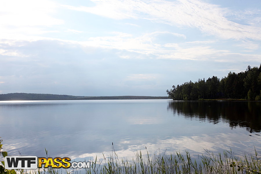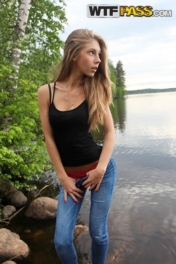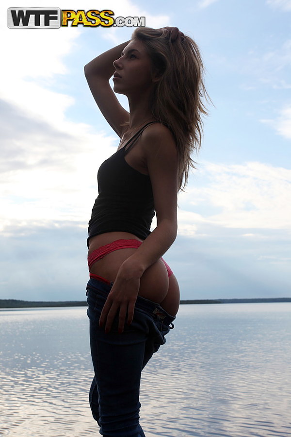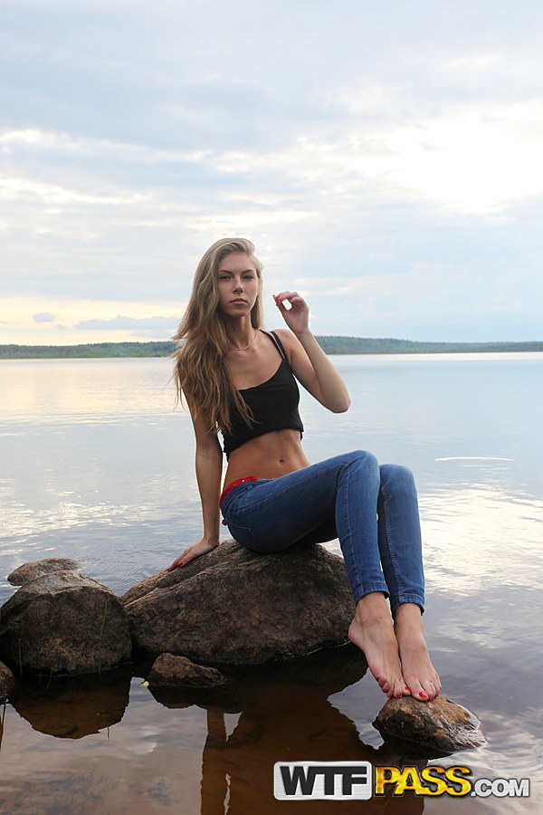 Девушка по соседству Меган показывает свои сиськи, сидя на камне в озере