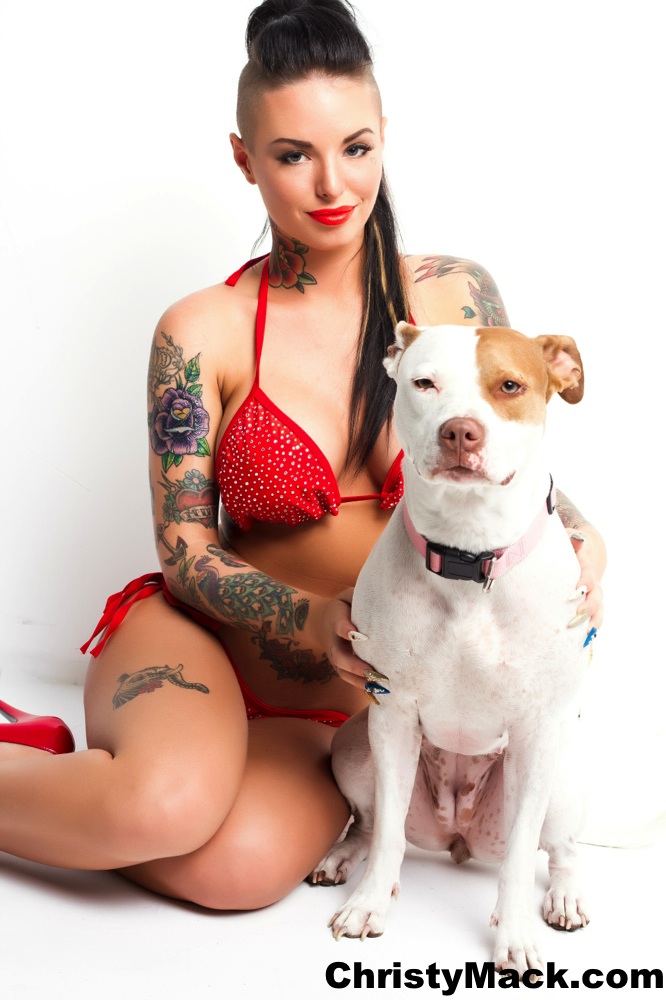 Горячая татуированная модель Кристи Мак позирует обнаженной в красном бикини и туфлях на каблуках в тон