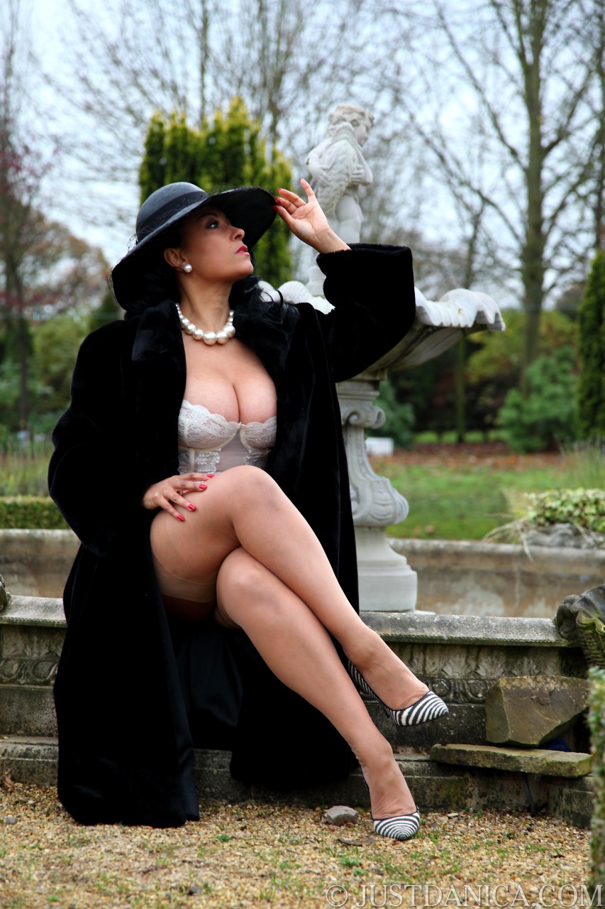 Классная зрелая женщина Даника Коллинз освобождает большие сиськи и попку от меховой шубы