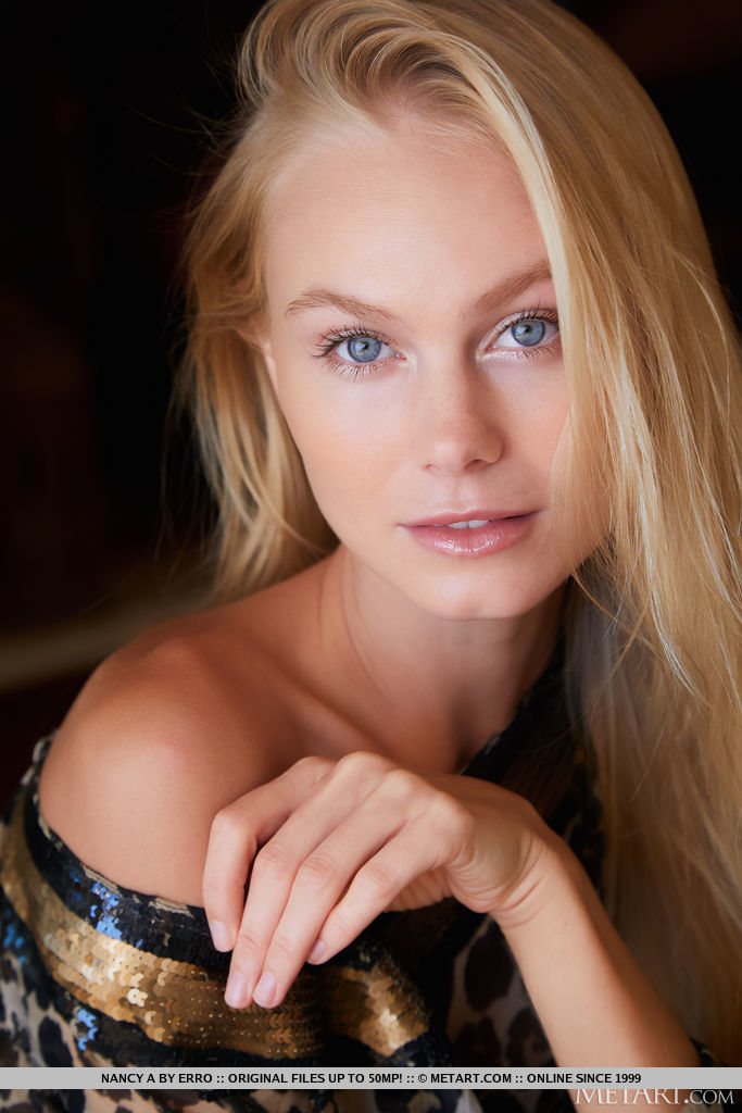 Красивая молоденькая блондинка Нэнси А полностью раздевается на Честерфилде