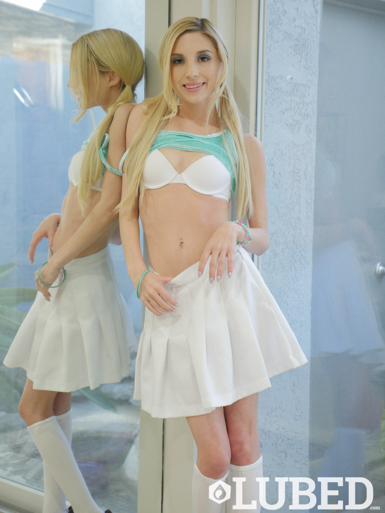 Милая блондинка Пайпер Перри снимает свои белые трусики и юбку