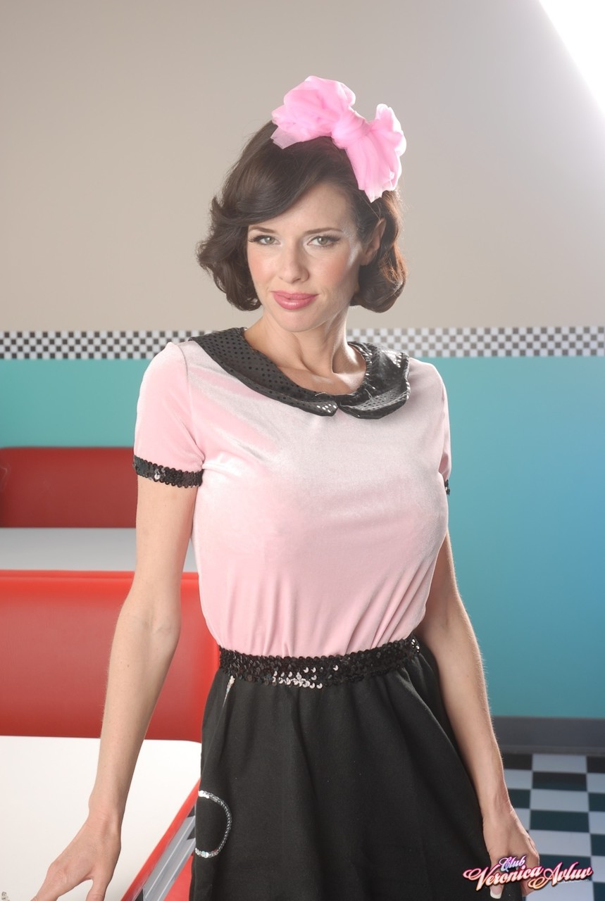 Модель в стиле Пинап Вероника Авлув демонстрирует свои кружевные трусики, прежде чем снять их