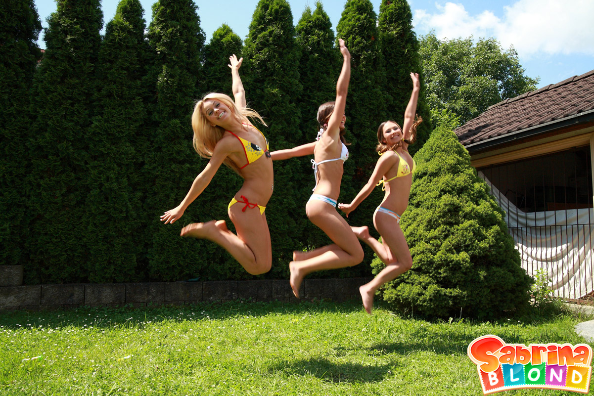 Молодая блондинка Сабрина Блонд и ее подружки лесбиянки ползают по лужайке в обнаженном виде