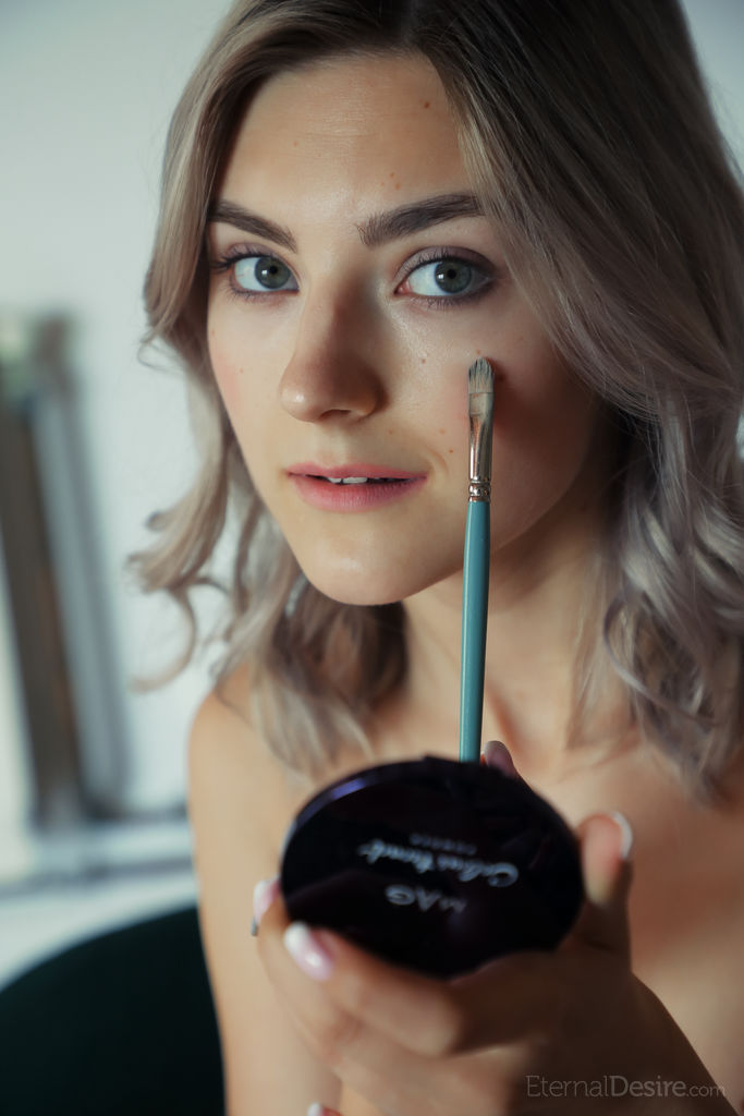 Молодая платиновая блондинка Ева Элфи делает макияж во время выступления обнаженной модели