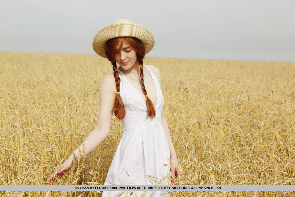 Молодая рыжеволосая Джиа Лисса раздевается догола во время пикника на овсяном поле