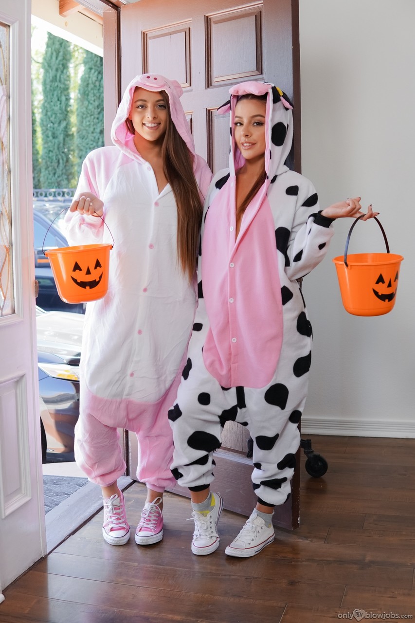 Молодые девушки Ванна Бардо и Джиа Дерза делают двойной минет во время розыгрыша сладостей