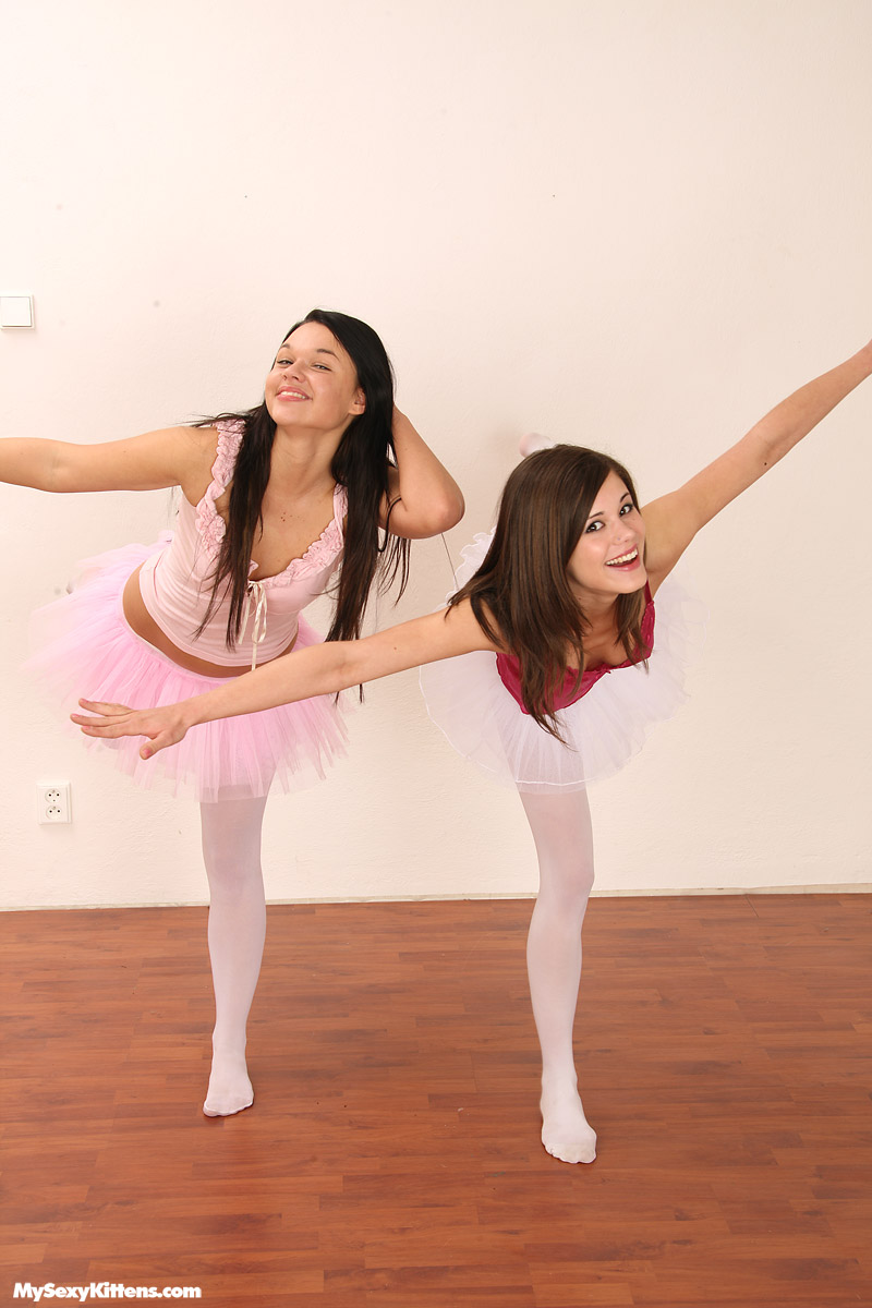 Молодые девушки занимаются лесбийским сексом в рваных колготках и пачках во время урока танцев