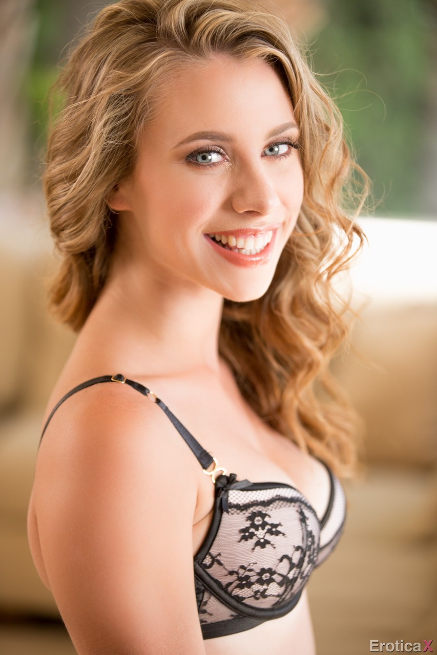 Натуральная блондинка Аня Олсен сексуально снимает свой лифчик и стринги