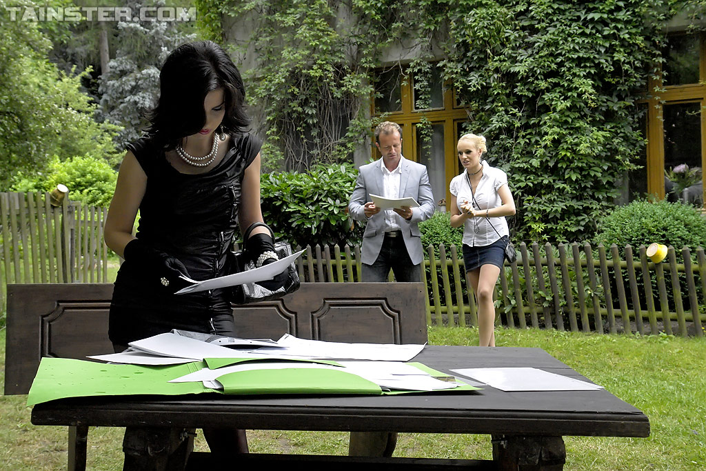 Полностью одетые женщины обоссываются после траха втроем на столе для пикника