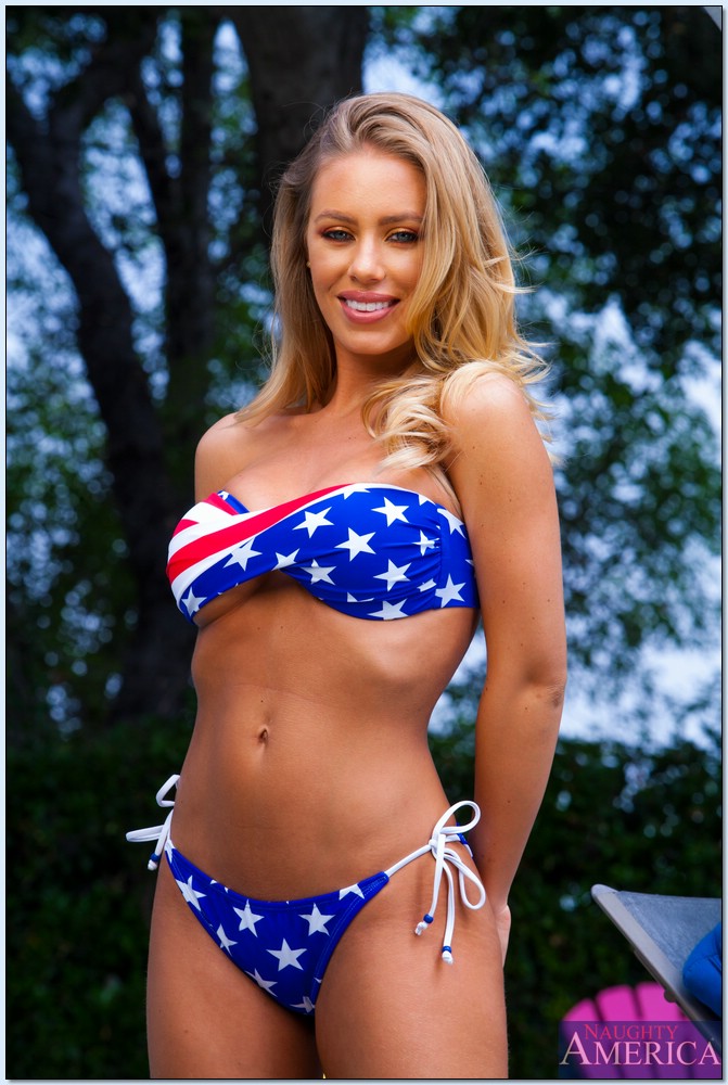 Привлекательная блондинка Николь Энистон снимает свое бикини у бассейна