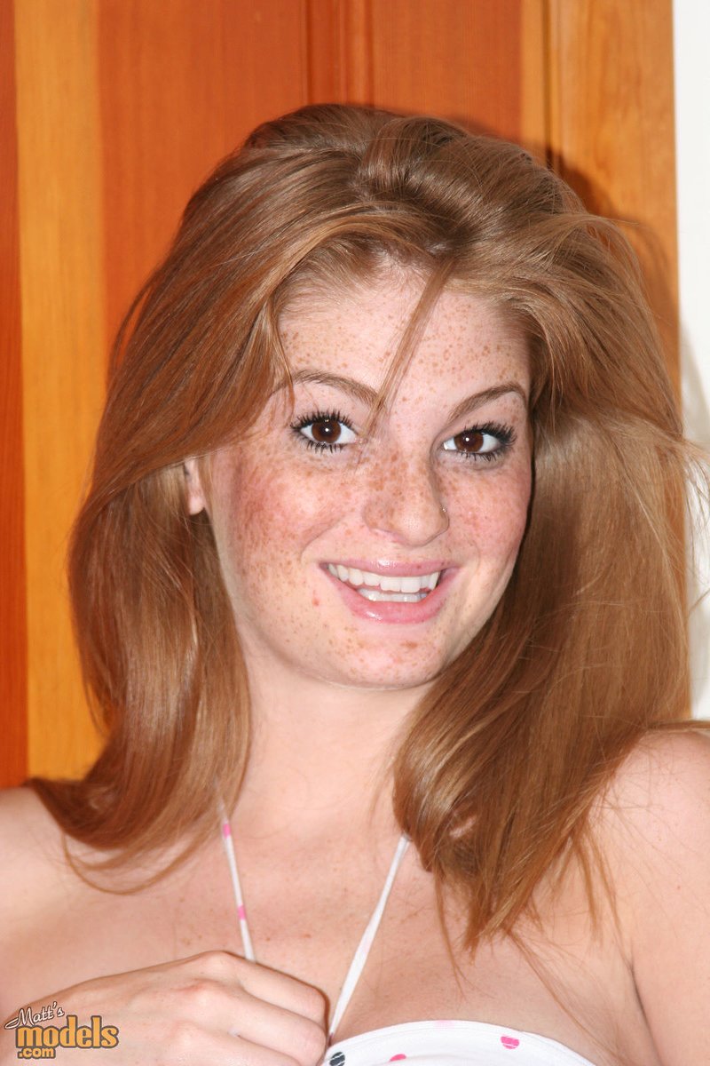 Рыжая с веснушками обнажает свои увеличенные сиськи, прежде чем потрогать пальцами свою розовую киску
