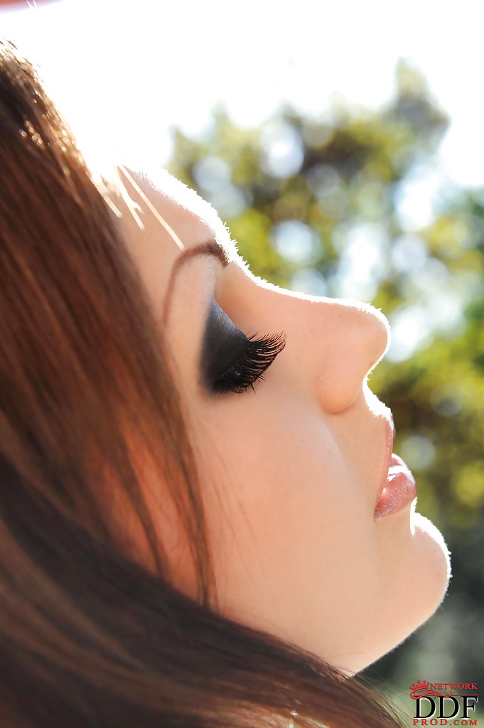 Сексуальная Тина Кей показывает свои маленькие сиськи и бритую киску на открытом воздухе