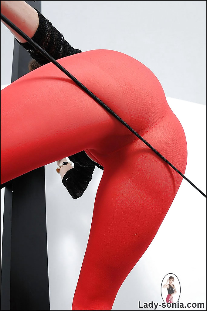 Сексуальная зрелая красотка с большими сиськами и горячей попкой позирует в красных колготках