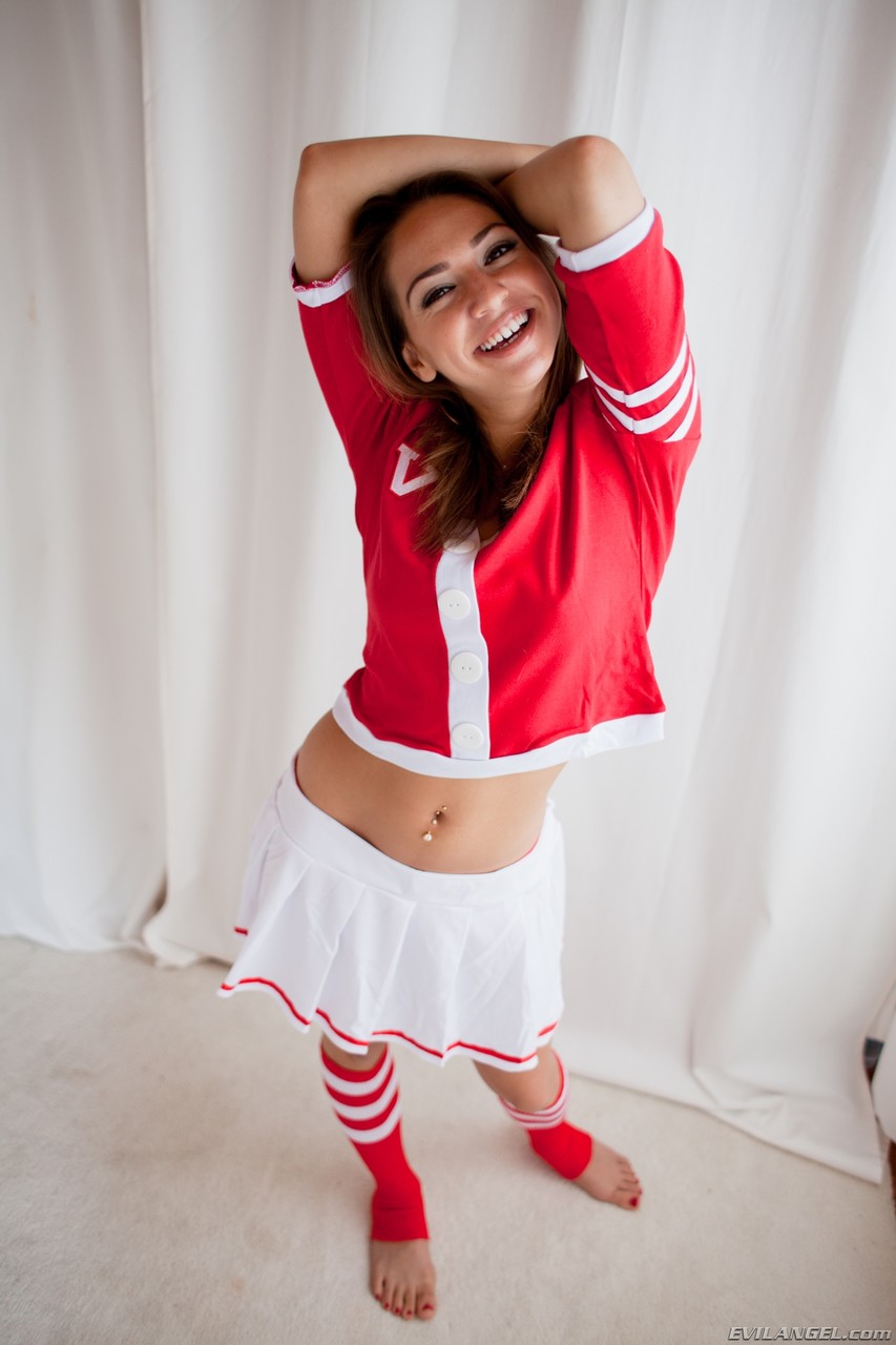 Симпатичная брюнетка-болельщица, сверкающая молодыми сиськами и попкой в спортивных носках