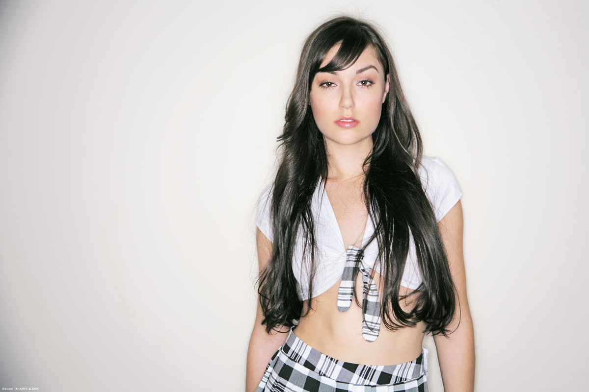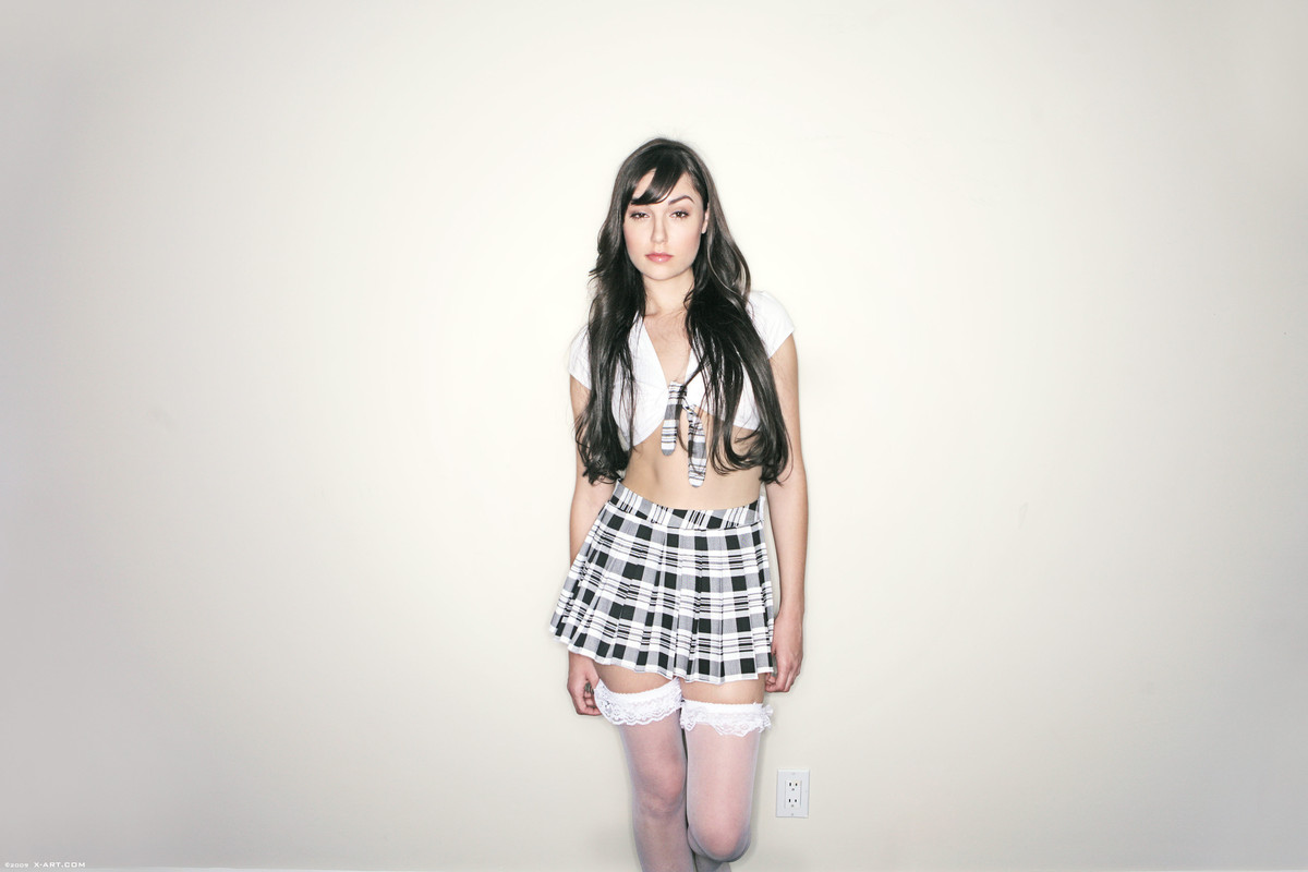 Сольная модель Саша Грей снимает свой топ, оставаясь в плиссированной юбке и чулках