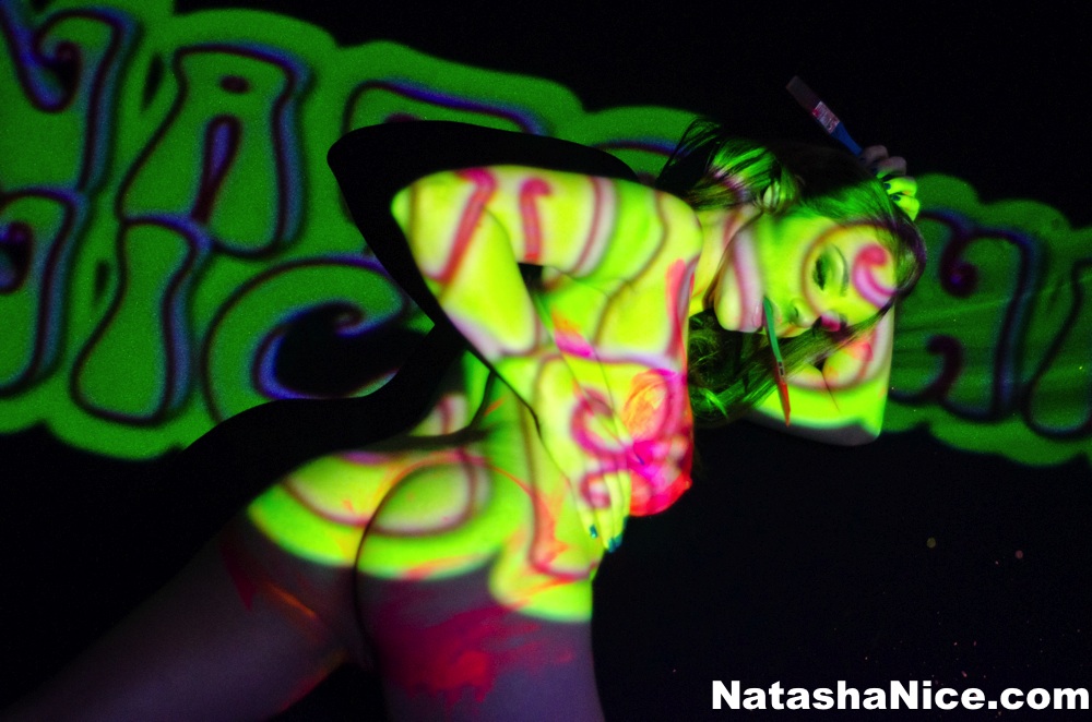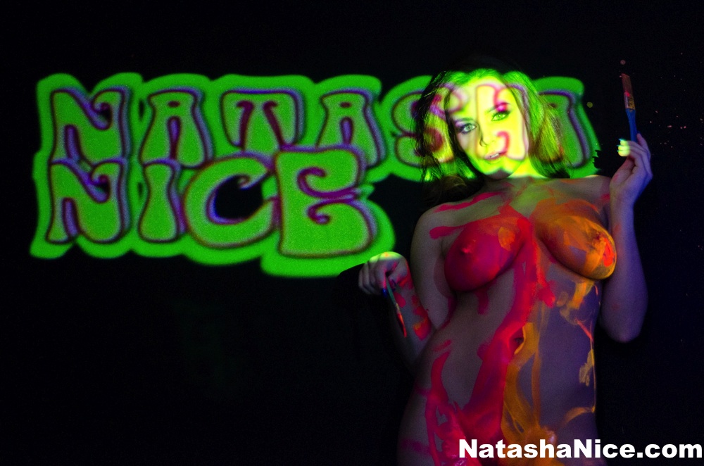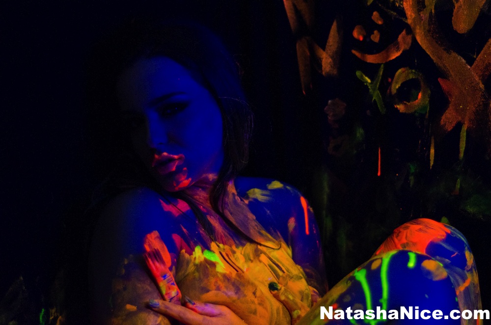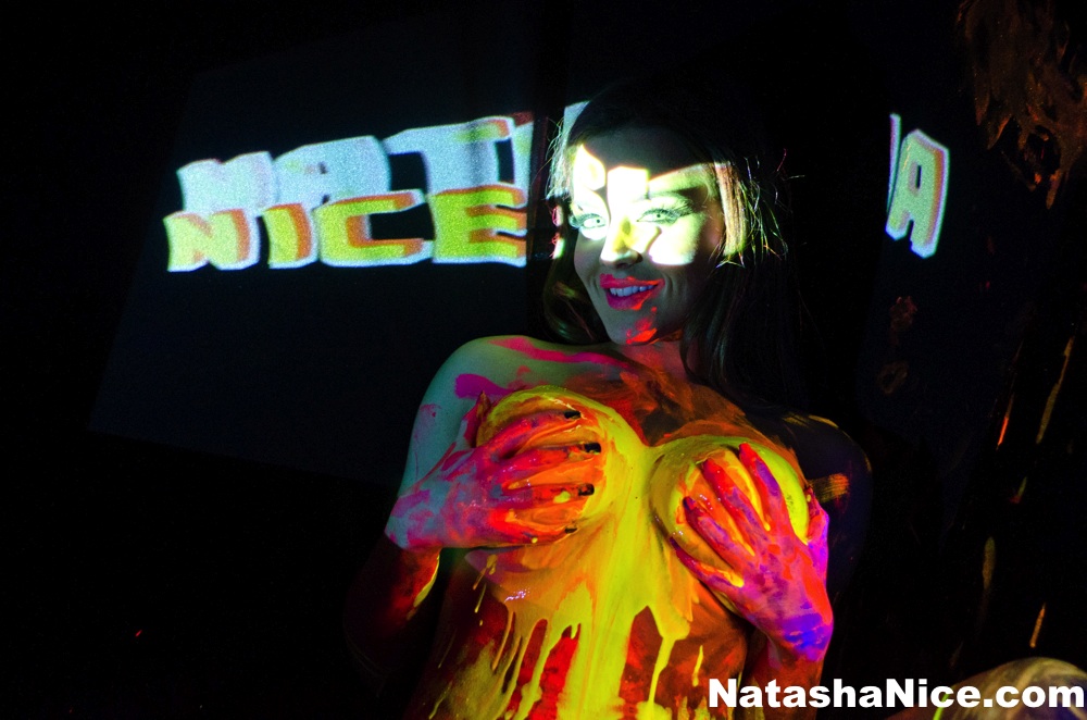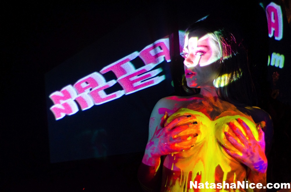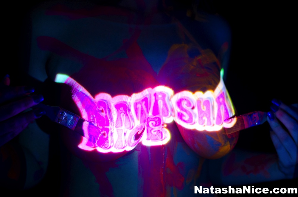 Соло-девушка Наташа Найс играет со своими большими сиськами под черным освещением