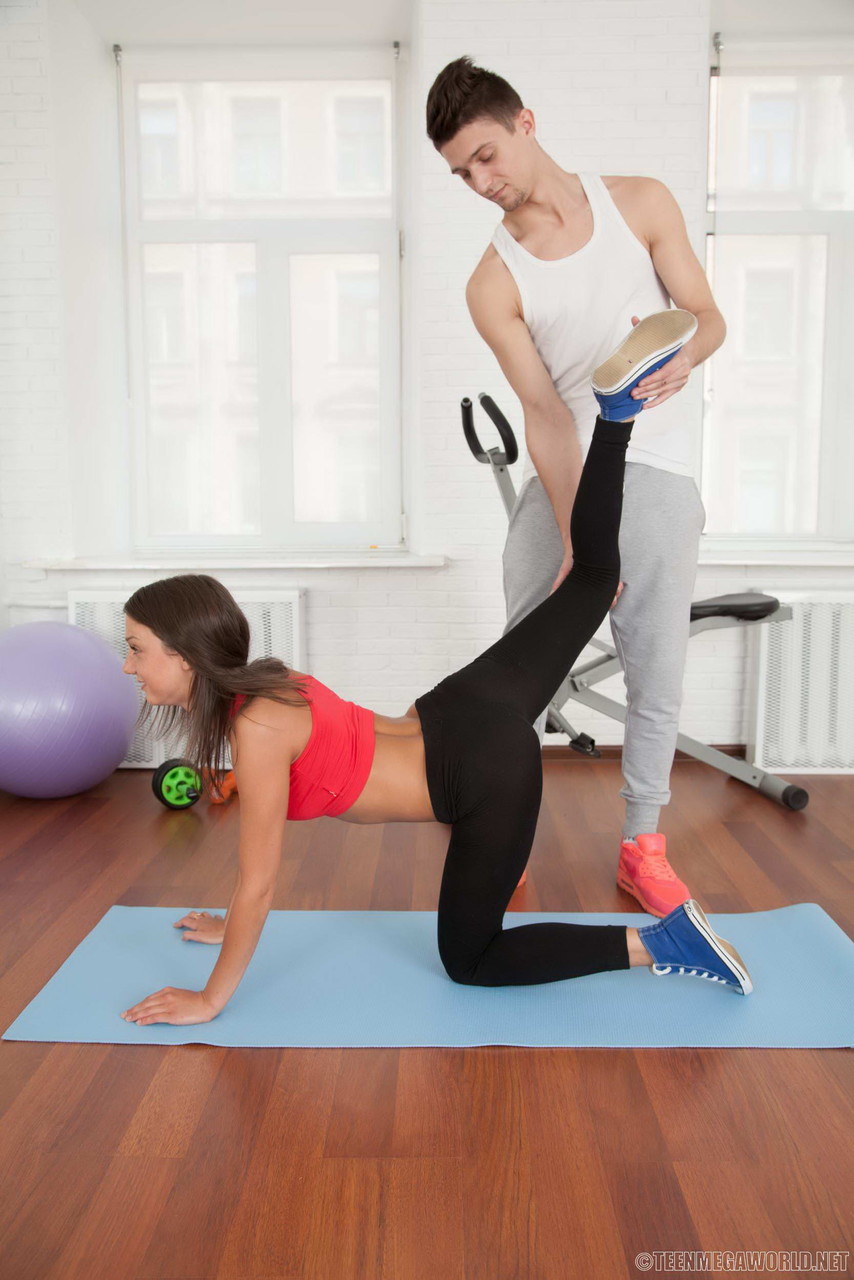 Спортивная девушка смазывает лицо спермой после секса со своим личным тренером