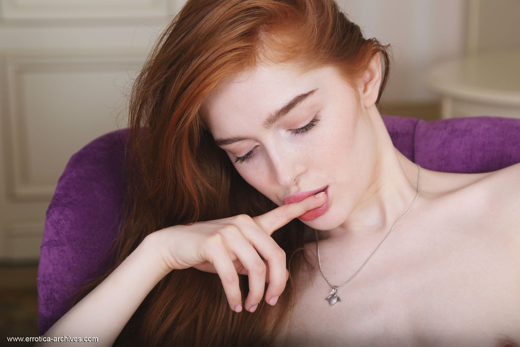 Светлокожая рыжеволосая Джиа Лисса гладит свою подстриженную киску, будучи полностью обнаженной
