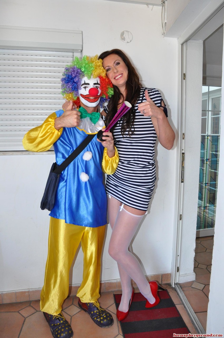 Высокая женщина Лара Латекс садится верхом на большой член клоуна во время секса