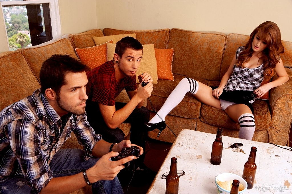 Возбужденная рыжеволосая Фэй Рейган соблазняет пару парней-геймеров в носках OTK